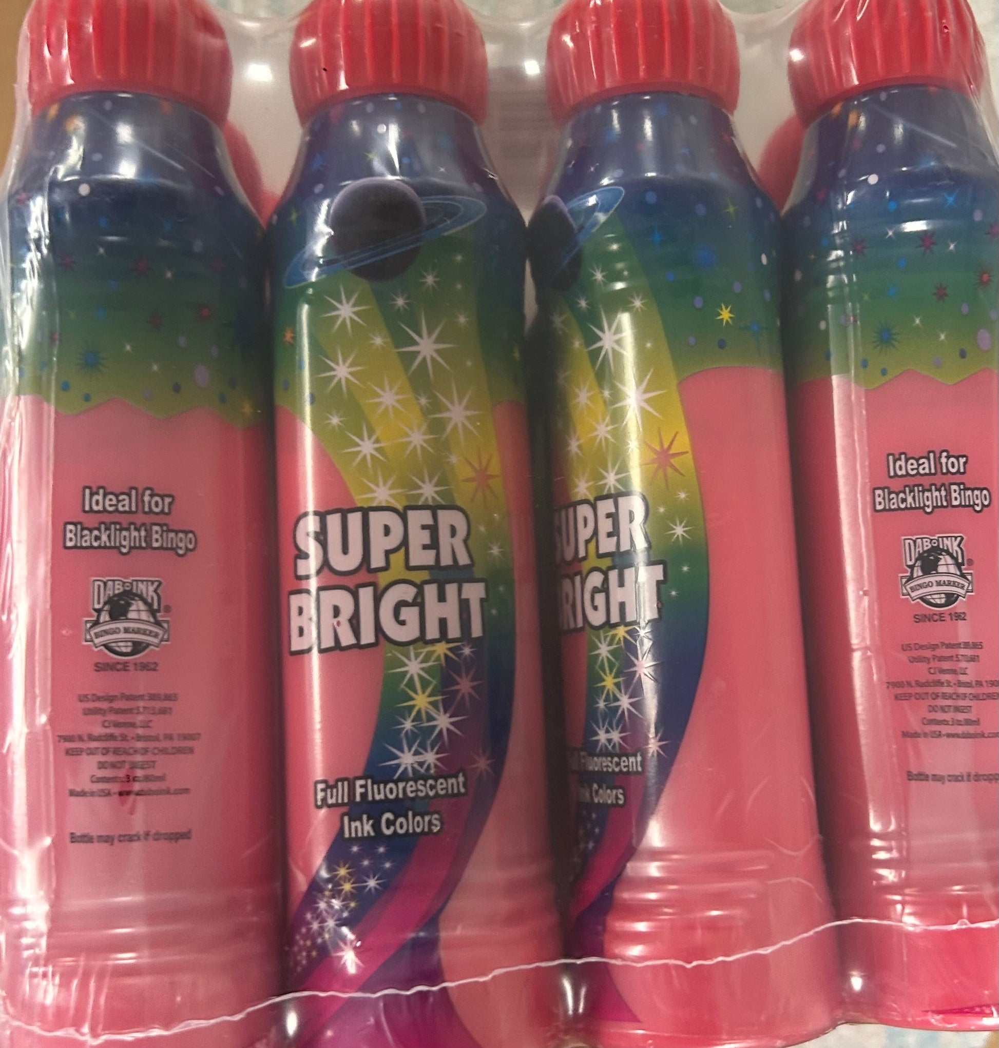 Add something vivid to every game with our Red Super Bright Fluorescent Bingo Daubers. Great for Blacklight Bingo! Each 3oz bottle is packed with high quality, quick drying bingo ink in a bold fluorescent finish, making it easy for players to mark cards clearly and keep the game moving. Designed with a comfortable grip bottle, these daubers are perfect for extended play at bingo halls, community events, and fundraisers.