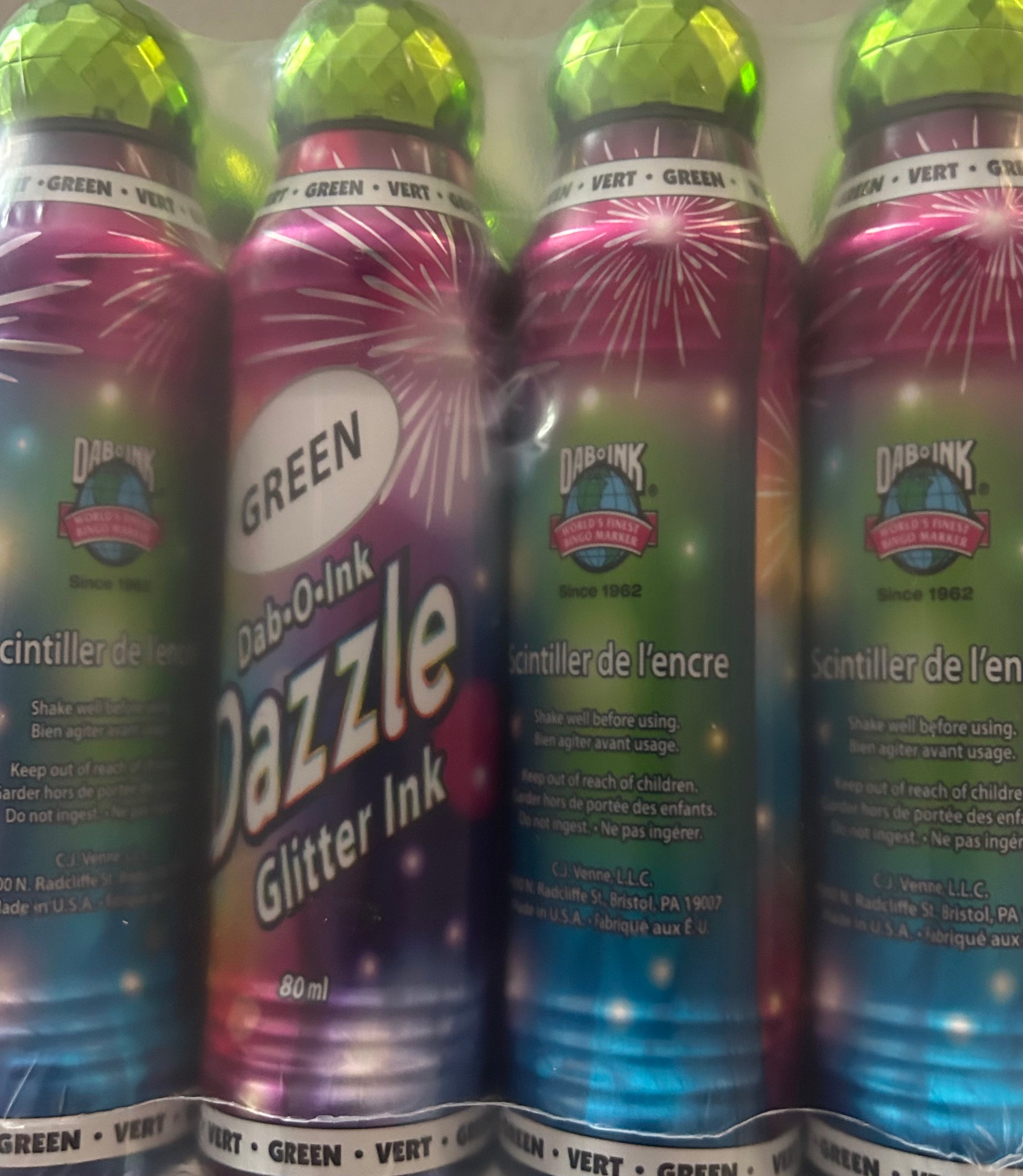 Add sparkle to every game with our Green Dazzle Glitter Bingo Daubers. Each 3oz bottle is packed with high quality, quick drying bingo ink in a bold glitter finish, making it easy for players to mark cards clearly and keep the game moving. Designed with a comfortable grip bottle, these daubers are perfect for extended play at bingo halls, community events, and fundraisers.
