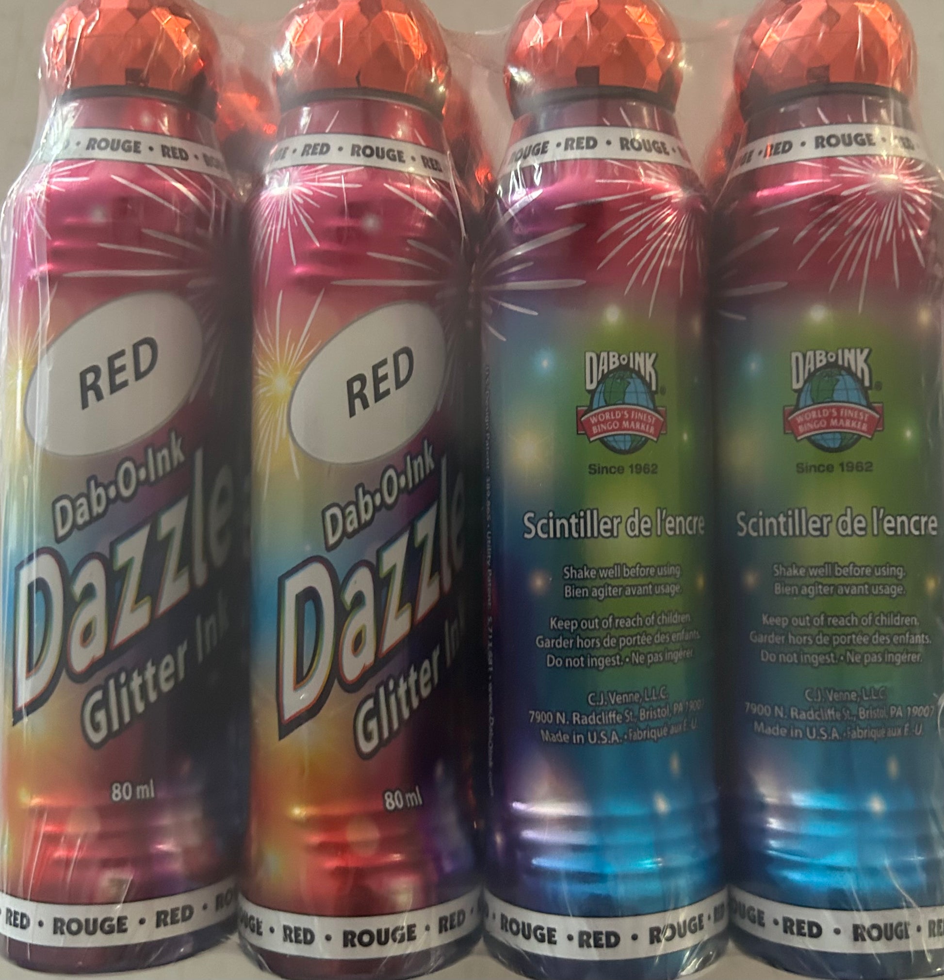 Add sparkle to every game with our Red Dazzle Glitter Bingo Daubers. Each 3oz bottle is packed with high quality, quick drying bingo ink in a bold glitter finish, making it easy for players to mark cards clearly and keep the game moving. Designed with a comfortable grip bottle, these daubers are perfect for extended play at bingo halls, community events, and fundraisers.